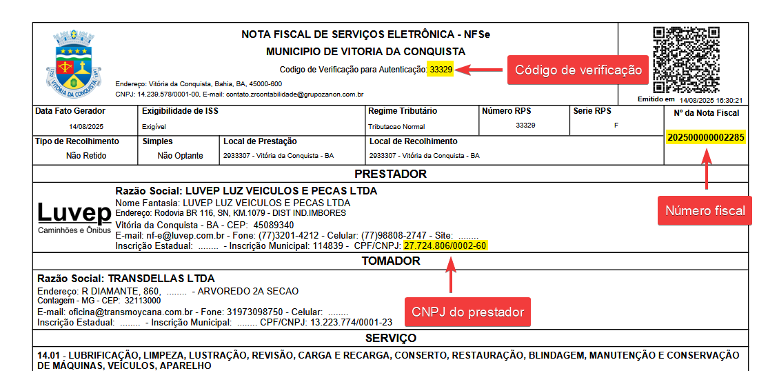 Exemplo de nota fiscal de serviço.