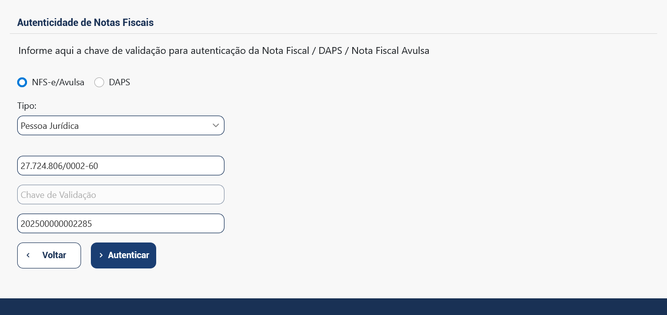 Note que a prefeitura de Vitória da Conquista pede apenas Chave de Validação (código de verificação) ou Número Fiscal. Ou preenche-se um, ou preenche-se outro. CNPJ é obrigatório.