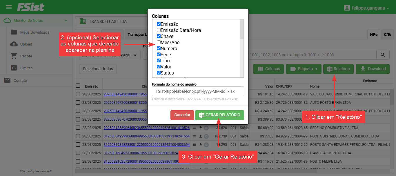 O FSist também permite gerar planilhas com todas as notas fiscais emitidas em determinado período.