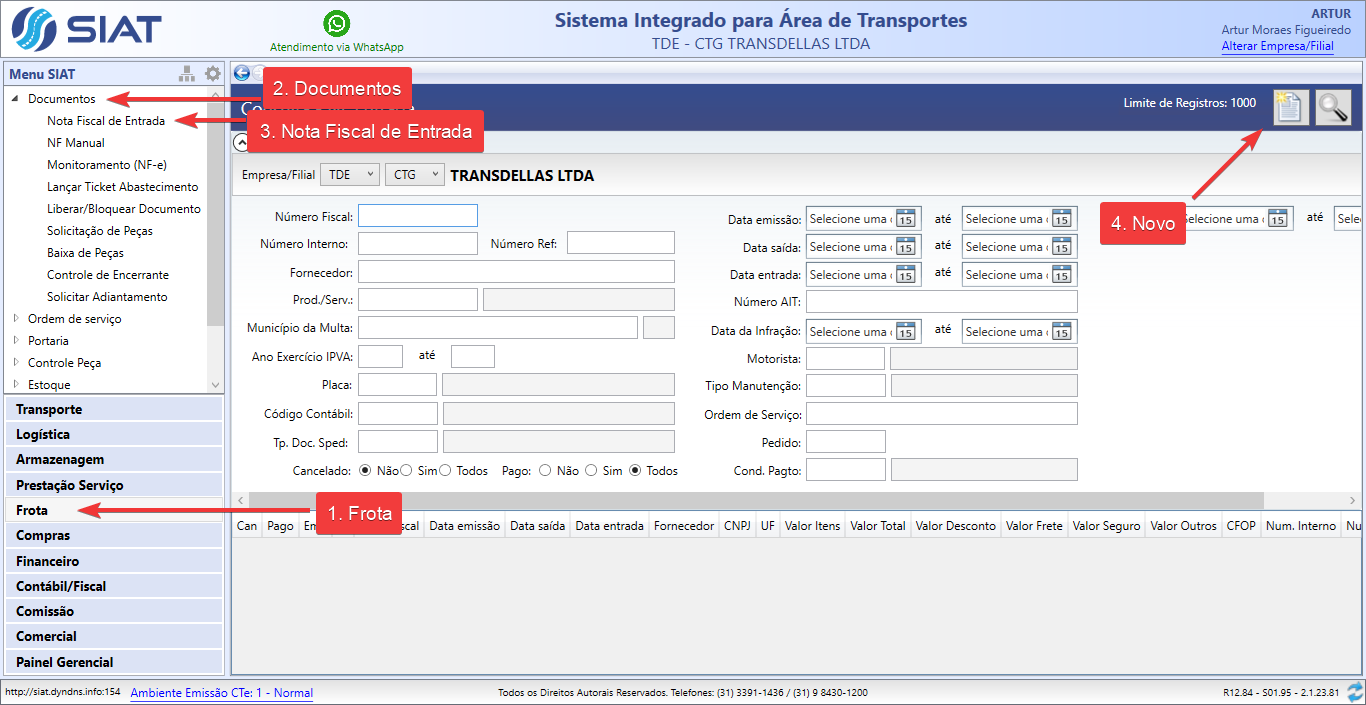Acessa-se Frota > Documentos > Nota Fiscal de Entrada > Novo