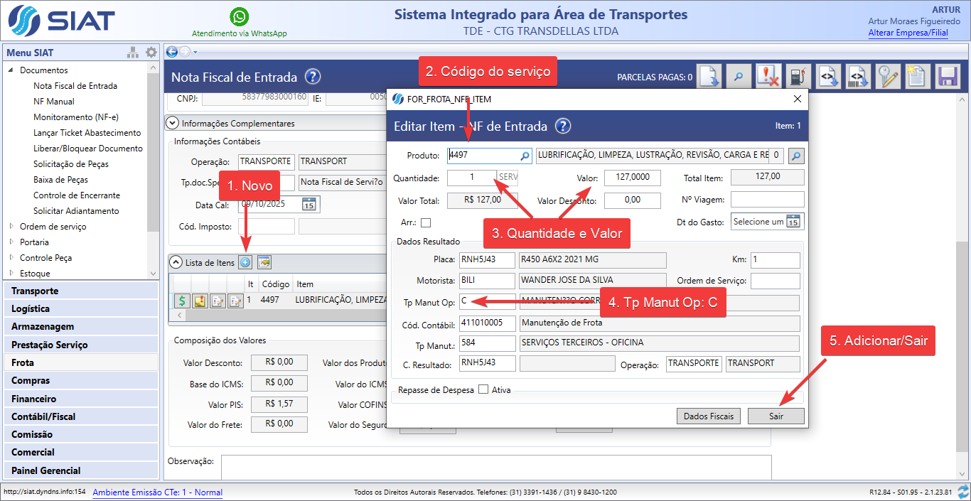 Preenche-se os dados da nota fiscal de serviço. Data Emissão, Data Saída e Data Entrada recebem o mesmo valor (data de emissão da nota fiscal), Km pode ser preenchido com “1” quando não houver informação, Tp Manut Op (geralmente) preenche-se com a letra C e em centro de resultado repete-se a placa.