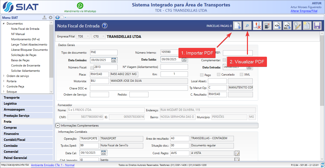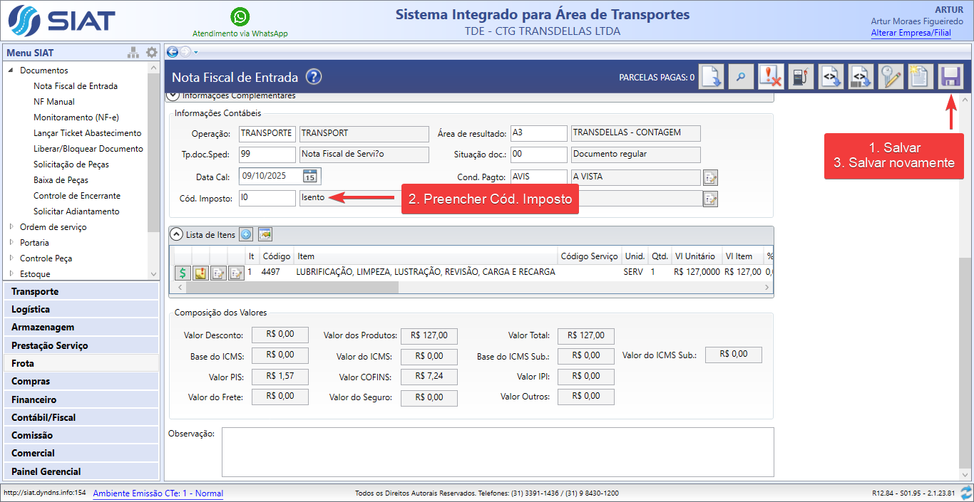 Preenche-se o Fornecedor, Operação (TRANSPORTE, LOGÍSTICA ou ADMINISTRATIVO geralmente), Tp.doc.Sped com 99, Área de resultado (A3 para Transdellas de Contagem; IT para Transdellas da Bahia).