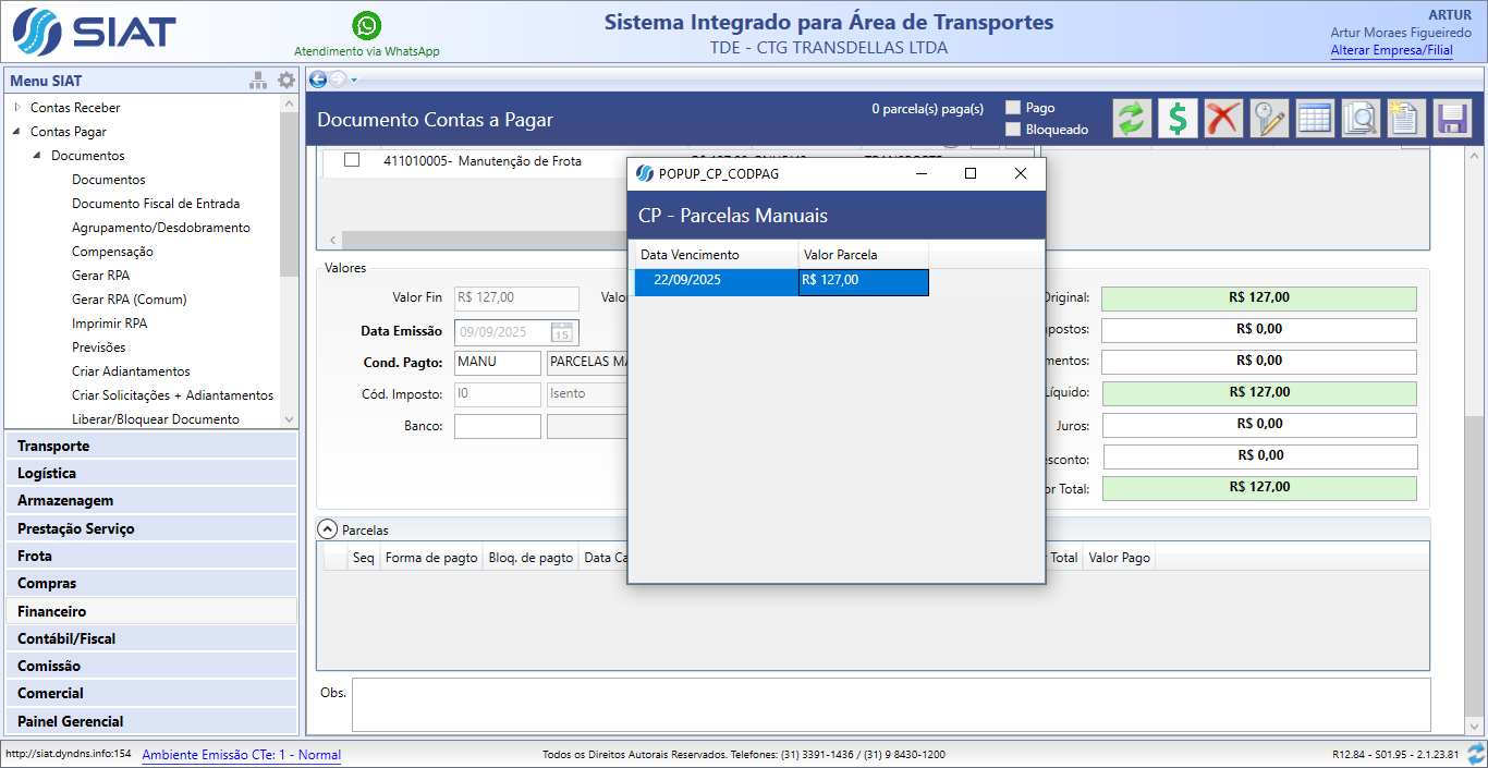 Quando houver mais de uma parcela, acessa-se o Contas a Pagar, abre-se o documento e programa-se as parcelas inserindo “MANU” no campo Cond. Pagto.