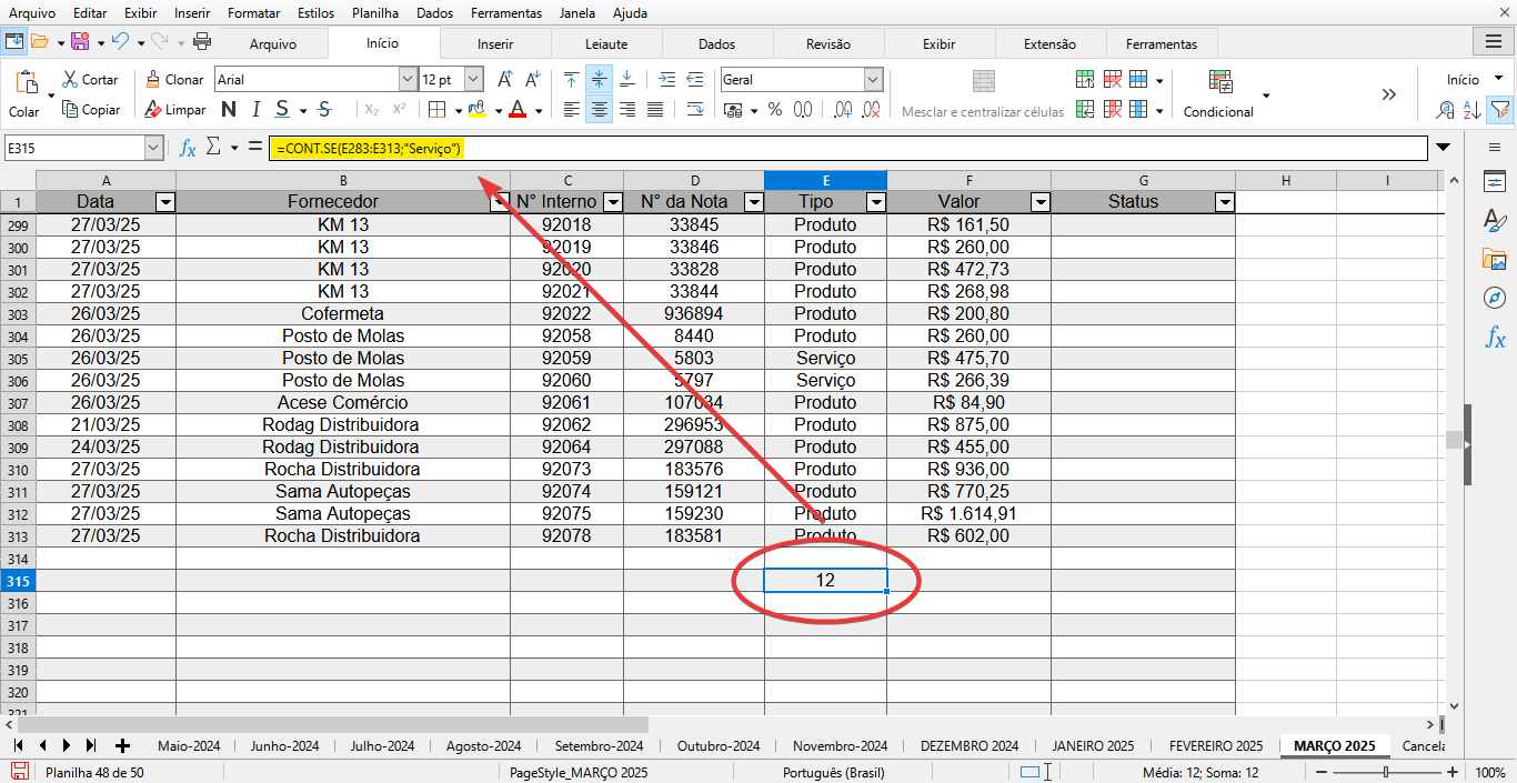 Utilize a função =CONT.SE() do Excel para agilizar a contagem de notas fiscais de serviço. Depois, conte quantas notas estão salvas e veja se o resultado bate com o número que o Excel retornou.