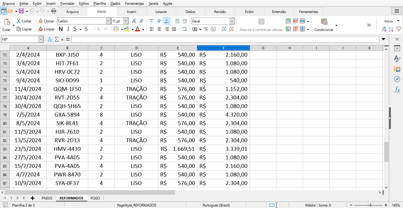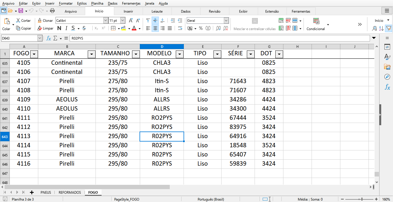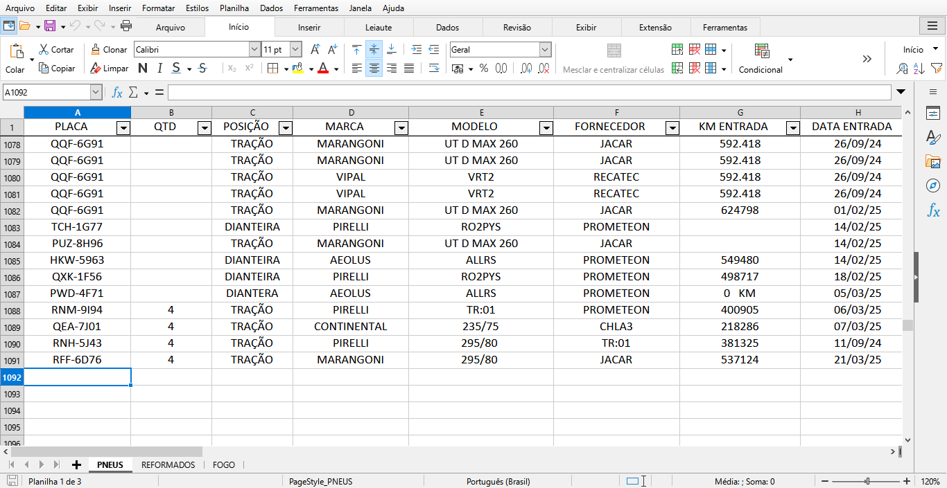 A planilha “TROCA DE PNEU FROTA.xlsx” é um documento localizado no servidor que visa controlar os pneus que estão tendo seu uso destinado aos veículos da frota. Nela, controla-se os pneus novos aplicados, reformados e numeração de fogo.