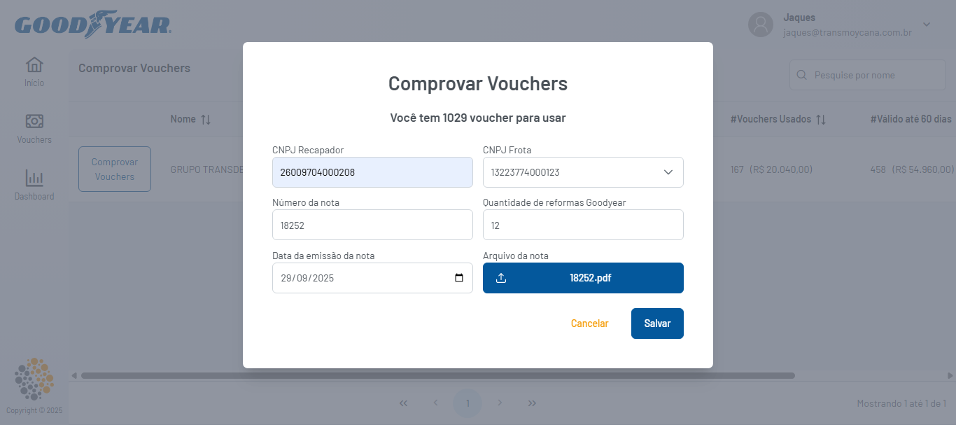 Por fim, preenche-se os dados da nota fiscal, incluindo CNPJ do fornecedor (geralmente da Jacar de Matias Barbosa; 26.009.704/0002-08), CNPJ da frota (Transdellas matriz; 13.223.774/0001-23), número da NF, quantidade de pneus reformados, data de emissão da nota e PDF da nota fiscal, que pode ser baixado do site da prefeitura.
