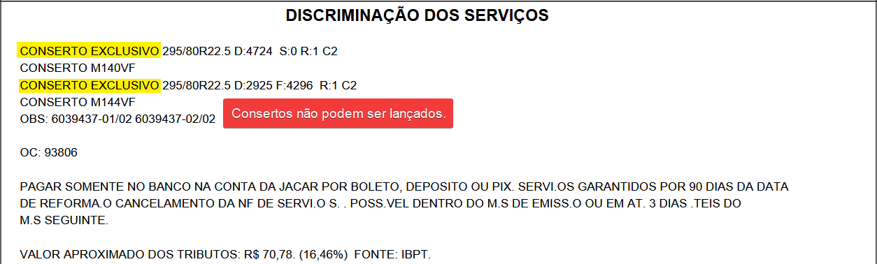 Notas fiscais emitidas pela Jacar referentes a consertos de pneus não devem ser incluídas no Portal Goodyear, apenas notas referentes a recapagens. Normalmente consertos ficam em torno de R$ 215,00, enquanto recapagens variam entre R$ 628,00, R$ 570,00 e R$ 808,00, a depender do tipo de pneu reformado.
