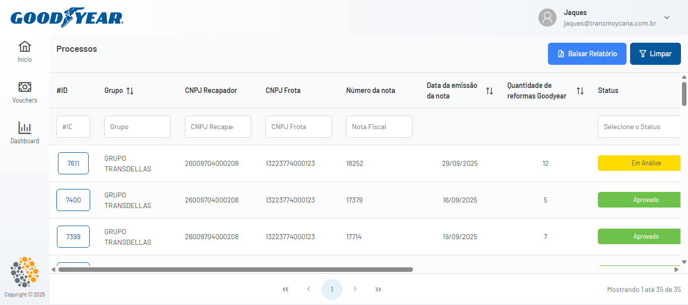 Nessa tela, pode-se consultar quais notas fiscais já estão lançadas no portal e quais processos ainda estão em análise pendente ou foram recusados pela Goodyear.